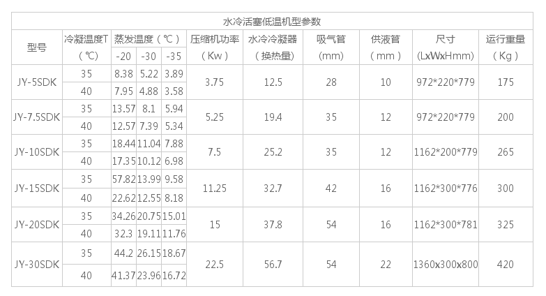 產品型號:JY-10SDK 選用06DR337壓縮機 價格:16220元產品說明: 產品特點:1. 選用半封閉制冷壓縮機,質量好,可靠性高。2. 水冷機組采用高效殼管式冷凝器,換熱效率高,使用壽命長。3. 采用國際知名品牌制冷配件,性能穩定可靠。 標準配置: 壓縮機、曲軸箱加熱器、殼管式水冷冷凝器、干燥過濾器、儀表盤、低溫(雙機)加油分、氣分